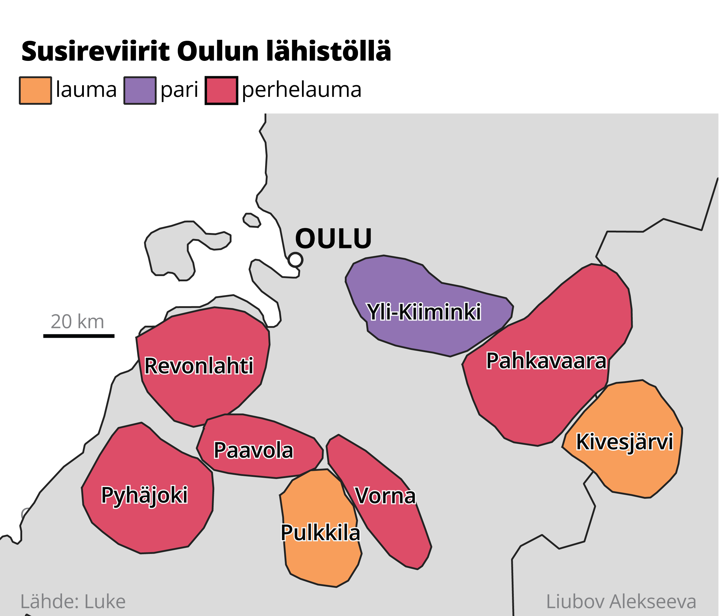 Susireviirit Oulun alueella viime syksyn tilanteen mukaan.