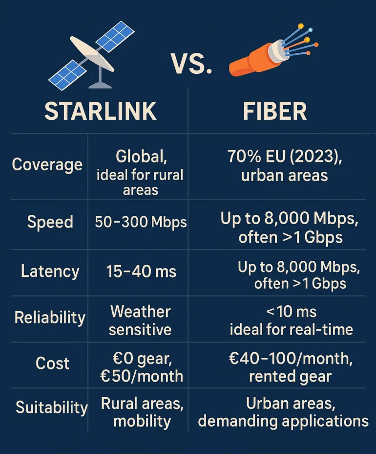 Starlink käyttää matalalla Maan kiertoradalla (LEO) olevien satelliittien tähdistöä, mikä mahdollistaa lähes maailmanlaajuinen kattavuus – jopa syrjäisimmässä Euroopan kylissä, joissa optiikka on edelleen vain lupaus vaalimainoksissa. Vuoden 2023 tietojen mukaan EU saavuttaa 70 prosentin %-kuituoptiikan kattavuuden (FTTH/B), jonka mukaan maaseutualueet ovat edelleen jäljessä. Tämä tarkoittaa, että Starlink täyttää tällä hetkellä tyhjiön – kirjaimellisesti ja symbolisesti. Samaan aikaan viime kaudella se järkyttää myös hinnoittelupolitiikallaan, sillä Starlinkin hinta on vain 50 euroa/kk. Starlink vs. optiikka – Starlink voittaa tässä selvästi.