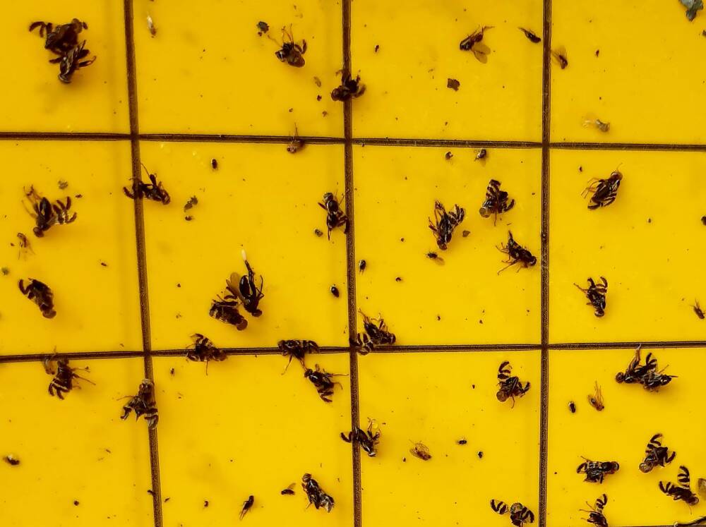 Kurppa on tarkkaillut tyrnikärpäsen lentoaikaa keltaliima-ansojen avulla. Tyrnikärpäsen siivet ovat tunnistettavan raidalliset. Kuva: Lasse Kurppa
