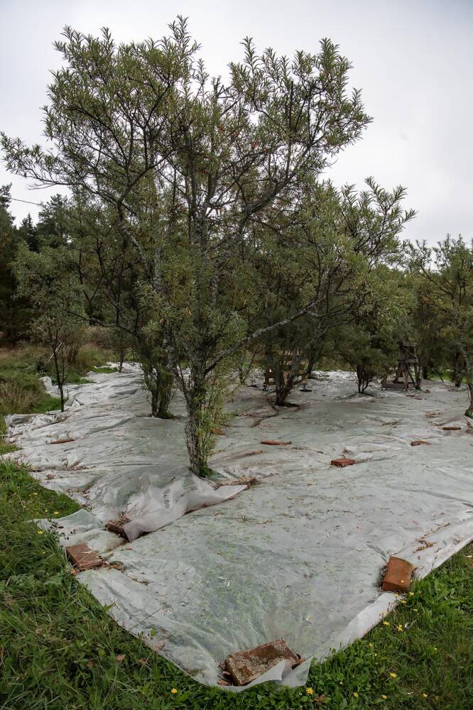– Jos nyt lähtisin perustamaan uutta tyrnitarhaa, niin etsisin tasaisemman paikan niin, että muovi toimisi vielä paremmin. Voisi myös kokeilla, että miten mansikkakangas toimii – meneekö toukka siitä läpi ja voisiko kangas olla maassa koko vuoden, mutta se on kustannuskysymys, Kurppa avaa.