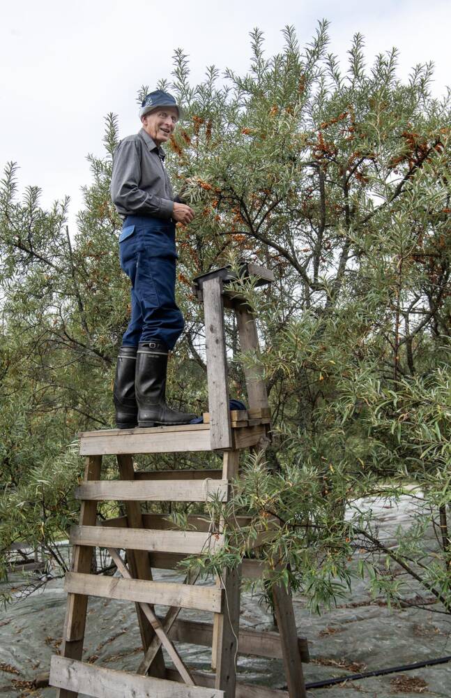 Tulevaisuuteen Kurppa tiirailee luottavaisin mielin – niin kauan kuin eläkeläisen terveys viljelyn sallii. Tyrnien poimiminen metrien korkuisista pensaista ei ole aivan riskitöntä. Se on kaksin tehtäväksi myös hidasta.