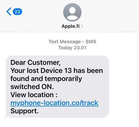 Viesti saapui 17. elokuuta ja oli kirjoitettu suomeksi. Tosin ääkkösiä ei osattu käyttää. Viestin lähettäjänä näkyi Apple. Mukana oli verkkolinkki, joka ei vastaa Applen oikeaa osoitetta kadonneen laitteen etsimiseksi. Oikea osoite on www.icloud.com/find.
