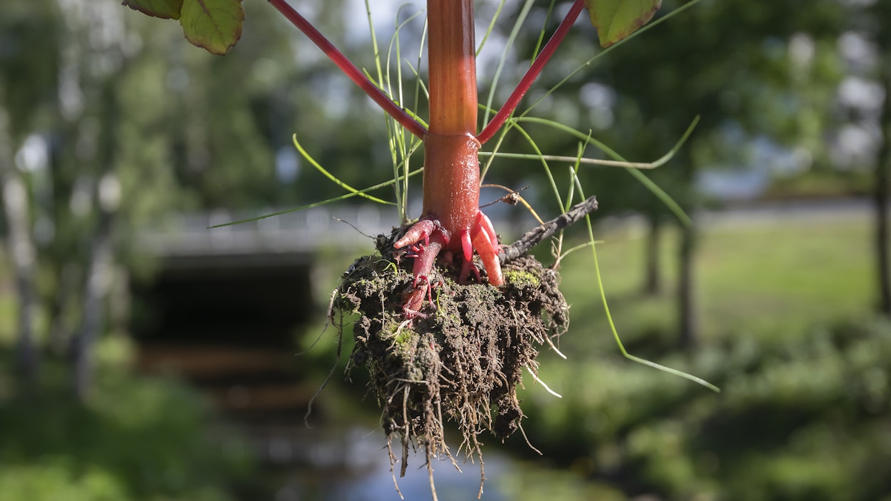 Jättipalsami on helppo nostaa maasta, koska sillä on mitättömät juuret. Kuva: Johannes Tervo