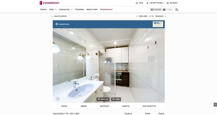 Tamperelaisen vuokra-asunnon keittiö on sijoitettu kylpyhuoneeseen. Kuvakaappaus Vuokraovi.comista