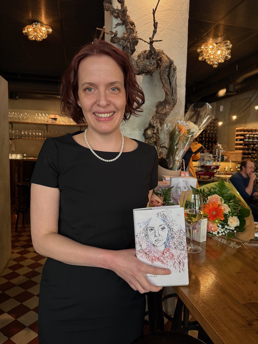 Kirjailija Soili Pohjalainen Perätilassa-kirjan julkkareissa 14.4.2025. Kirjan kansi näyttää tutulta, eikös?