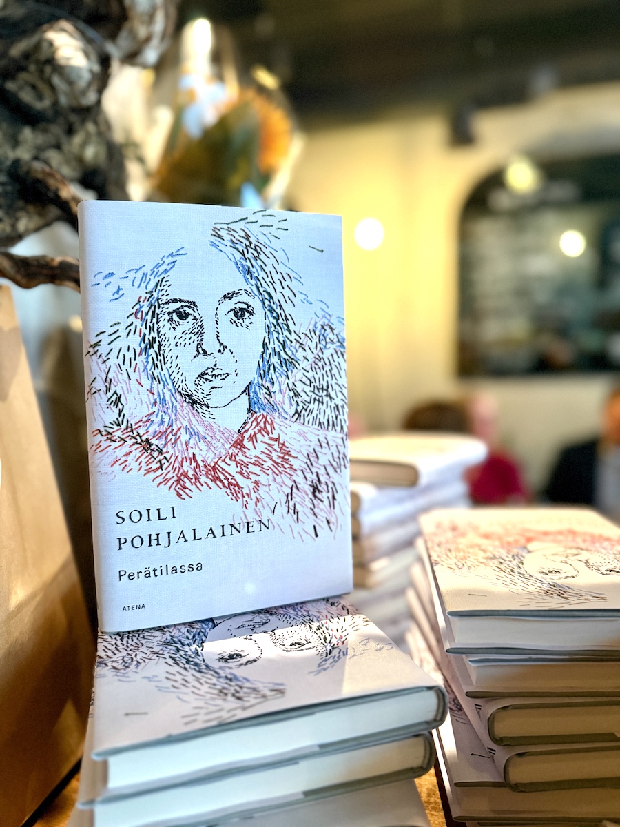 Ensikatseella Perätilassa-romaanin kansi näytti minusta vain viivoilta. Vasta kun kuulin kirjan julkkareissa, että Elina Warsta oli kirjonut Soilin näköisen naisen kuvan isoäitinsä nenäliinaan, toisen isoäitinsä langoilla, katsoin sitä uusin silmin: mikä oivallus, mikä taito!