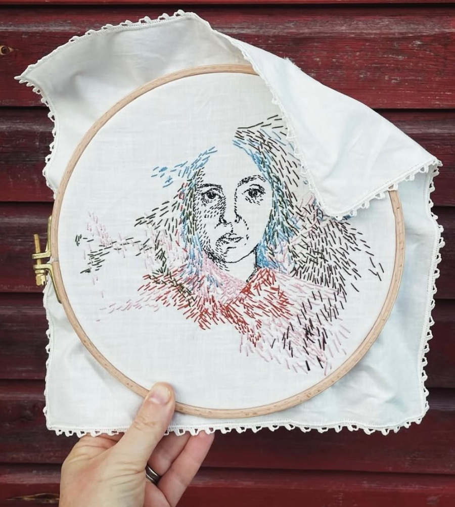 Perätilassa-romaanin kannen on tehnyt ja ideoinut Elina Warsta. Hän kertoi hakeneensa vintiltä isänäitinsä vanhan kangasnenäliinan ja kaivaneensa esiin äidinäitinsä kirjontalangat. Kuva: Elina Warsta