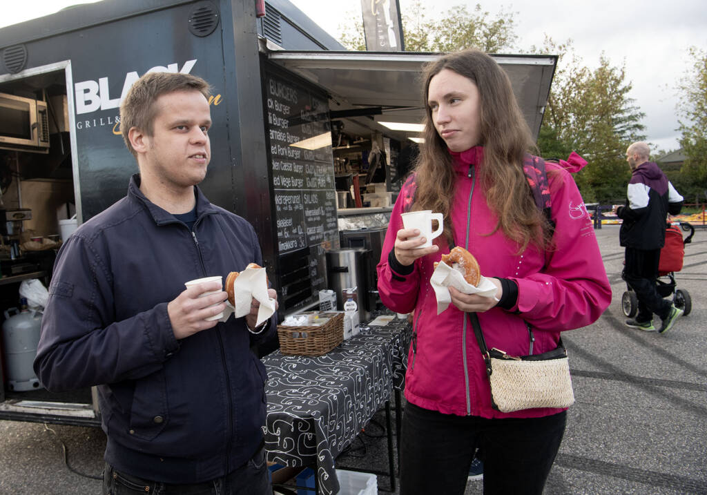 Niko Nivalinna ja Sanna Koivuaho aloittivat aamun Hansan tontilla munkkikahveilla. Kuva: SSS/Kirsi-Maarit Venetpalo
