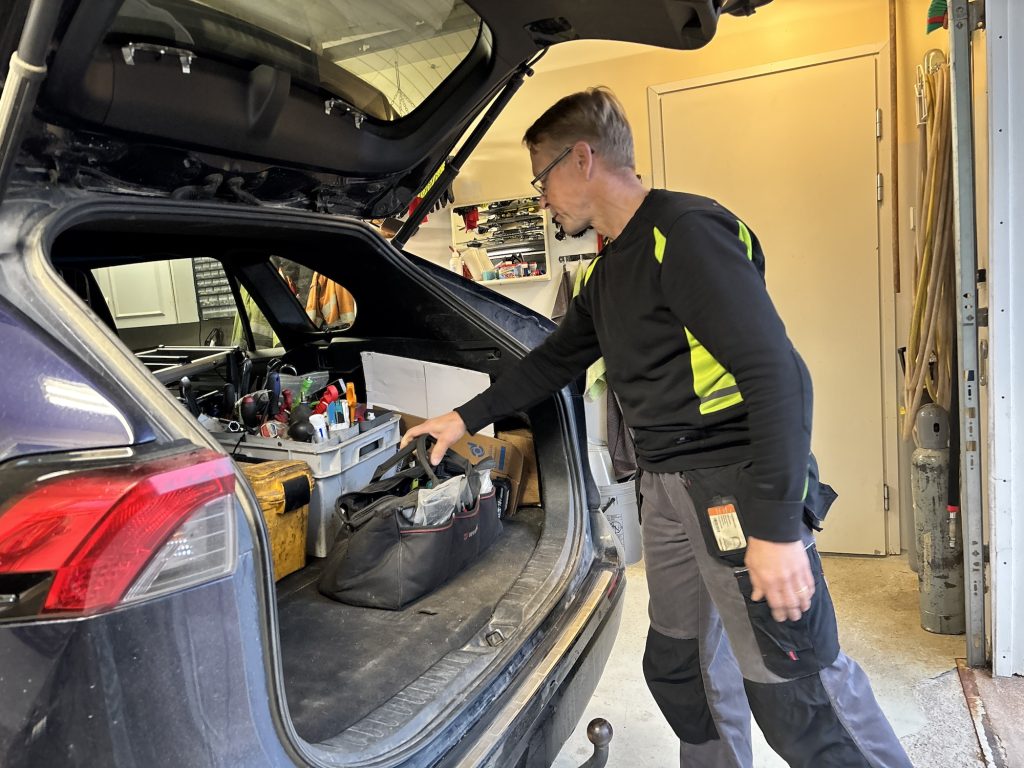 Konehuoltoihin erikoistunut Eino Mäkäräinen, 59, avaa Toyota Rav4 -autonsa takaluukun ja esittelee työkalujaan. Kaikki on asetettu siistiin järjestykseen, jotta tarvittava esine löytyy nopeasti.