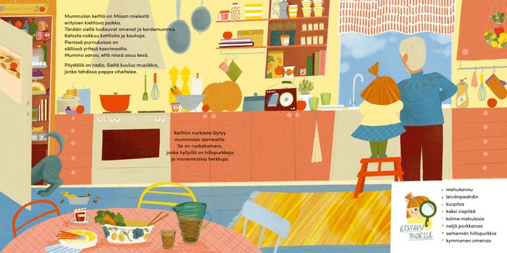 Tervetuloa mummolaan! -kirja sisältää etsintätehtäviä, ja lukija voi löytää mummolasta monia tuttuja esineitä. Kirjan kuvitus: Mari Nikula