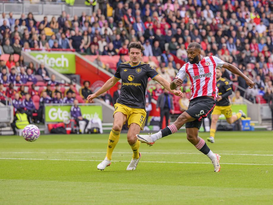 Manchester Unitedin Harry Maguire (vas,.) sai ihailla Igor Thiagon upeaa viimeistelyä lähietäisyydeltä. AOP