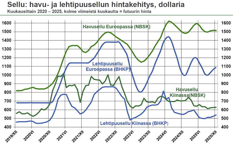 Vuoden 2025 viimeisen neljänneksen lyhytkuituisen lehtipuusellun futuurihinnat Euroopassa (+3,0 prosenttia) ja Kiinassa (+4,4 prosenttia) ovat pienessä nousussa verrattuna vuoden 2024 kolmanteen neljännekseen, mutta laskua on kertynyt Euroopassa 2,8 prosenttia ja Kiinassa 4,8 prosenttia vuoden takaiseen eli vuoden 2024 neljänteen neljännekseen.