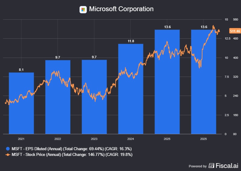 Microsoftin osakekohtaisen tuloksen (EPS) ja osakekurssin kehitys viiden vuoden aikana.