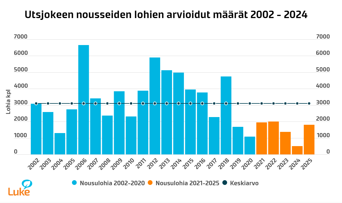 Kuva 2. Utsjokeen nousseiden lohien arvioidut määrät vuosina 2020-2025 vedenalaisen videoseurannan perusteella. Vuoden 2025 tulos on alustava. Musta katkoviiva kuvaa pitkän aikavälin (2002-2024) keskiarvoa. Siniset pylväät kuvaavat aikajaksoa, jolloin lohenkalastus oli Tenolla ja Tenovuonossa sallittua ja oranssit pylväät aikajaksoa, jolloin lohenkalastus on ollut kiellettyä. Molempien kuvien tarkat luvut löytyvät Luken verkkosivun kuvista.
