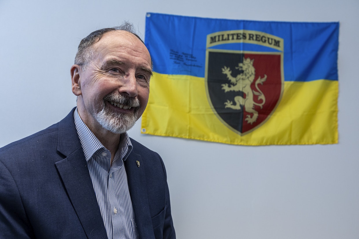 Pekka Toverin toimiston seinällä Brysselin EU-parlamenttirakennuksessa on Ukrainan maavoimien 24. moottoroidun jalkaväkiprikaatiin lippu. Sen perinnejoukko oli neuvostoaikana maavoimien 24. jalkaväkidivisioona, joka hyökkäsi talvisodassa Summan suunnassa. Kuva: Juha Roininen / EUP-IMAGES
