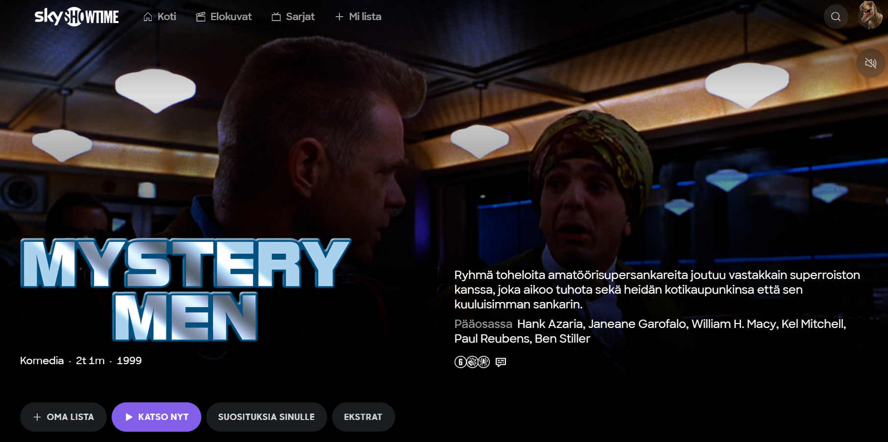 Mystery Men (1999) eli Seitsemän seinähullua sankaria on saapunut tällä viikolla SkyShowtimen valikoimaan. Tähän asti hönö, mutta tietyllä tavalla myös sympaattinen komedia on ollut Suomessa katsottavissa vain vod-palveluiden vuokra- ja myyntiversioina.