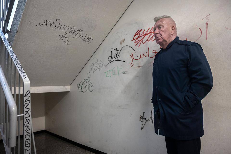 Aina elo Symppiksen ja ravintola Idänpisteen kanssa ei ollut sopuisaa. Kuvassa Lahikainen seisoo vuonna 2023 ravintolan viereisessä rapussa, joka on sotkettu. Sami Kuusivirta