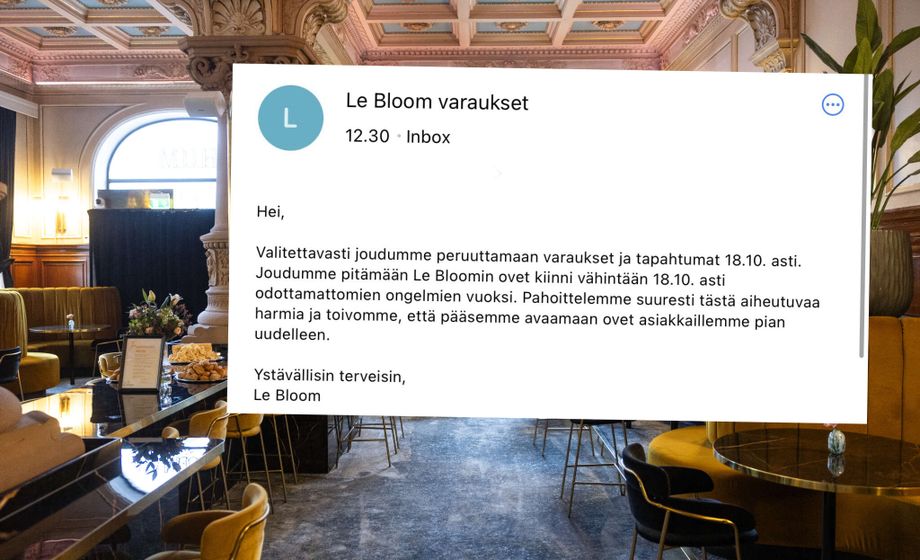 – Valitettavasti joudumme peruuttamaan varaukset ja tapahtumat 18.10. asti. Joudumme pitämään Le Bloomin ovet kiinni vähintään 18.10. asti odottamattomien ongelmien vuoksi. Pahoittelemme suuresti tästä aiheutuvaa harmia ja toivomme, että pääsemme avaamaan ovet asiakkaillemme mahdollisimman pian uudelleen.