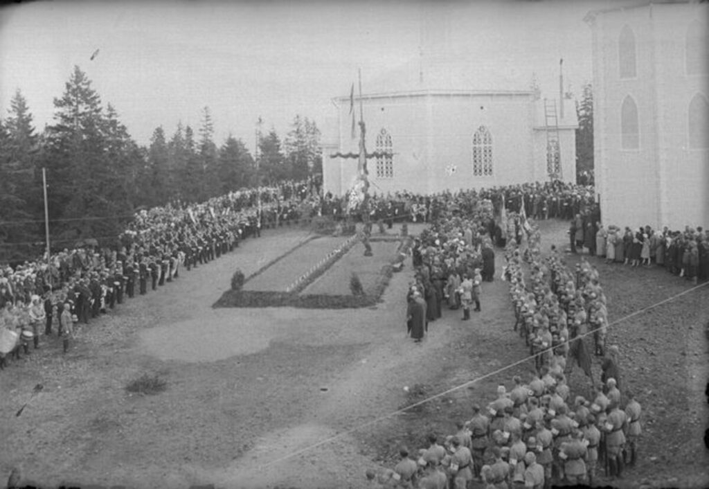 Muistotilaisuus onnettomuuden uhreille Reposaaren kirkon kirkkomaalla. Kuvan keskellä uhrien yhteishauta-alue, jonka yhteydessä suuri risti, sekä S2:n keulamasto. (Emil Kustaa Klint/Satakunnan museo/Museovirasto)