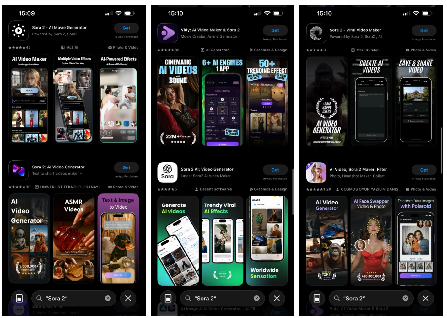 Aiheesta kirjoittavan 9to5Macin mukaan Soraa mukailevat sovellukset ovat nyt pitkälti kadonneet App Storesta ja Google Playsta, mutta vielä joitakin hetkiä sitten hakusana Sora 2 tuotti useita hakutuloksia hyvin samankaltaisen oloisista tekoälysovelluksista.