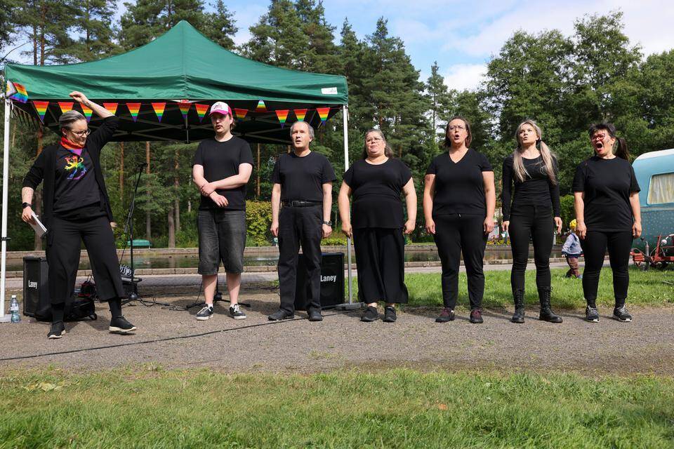 Kuusankosken teatterin improvisaatioryhmä Impi Rojauksen Perikunta esiintyi kesällä 2025 Kouvola Pride -tapahtumassa. Jussi Lopperi