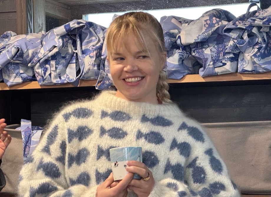 Vaalea nainen pitelee käsissään muumimukia. Hän osoittaa sen kylkeen maalattua Muumipeikkoa, joka on kuvassa hyppäämässä ”pommilla” avantoon.