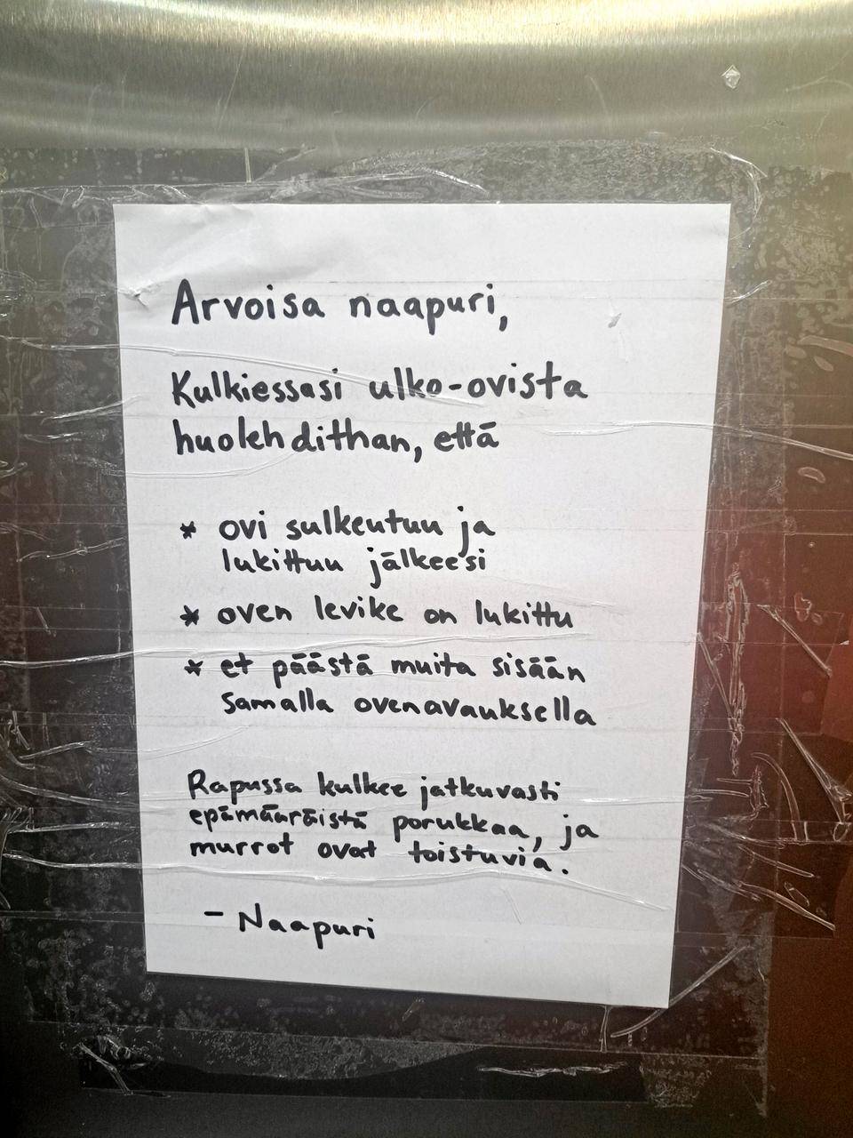 Asukkaat kokivat, ettei vuokranantaja tiedottanut ongelmista. Asukkaat viestivät toisilleen lapuilla. Lukijan kuva