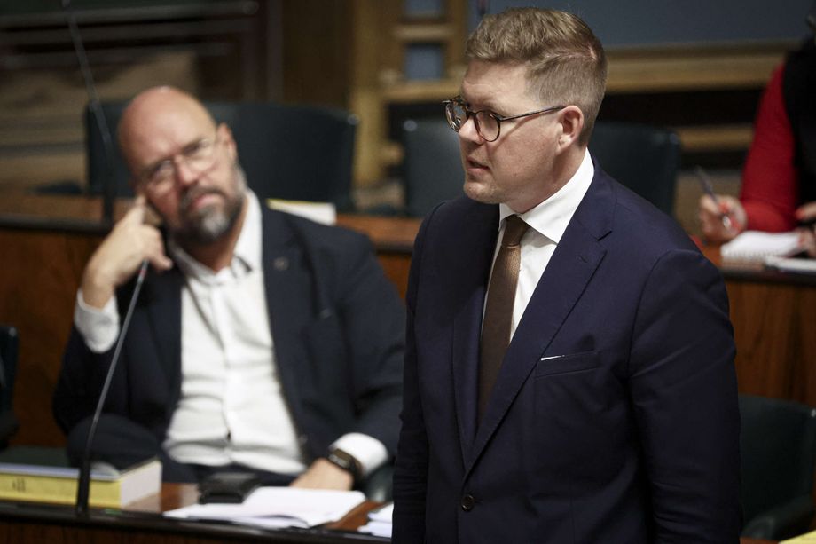 SDP:n puheenjohtaja Antti Lindtman puhumassa eduskunnassa. Taustalla SDP:n eduskuntaryhmän 1. varapuheenjohtaja Kim Berg. Pasi Liesimaa