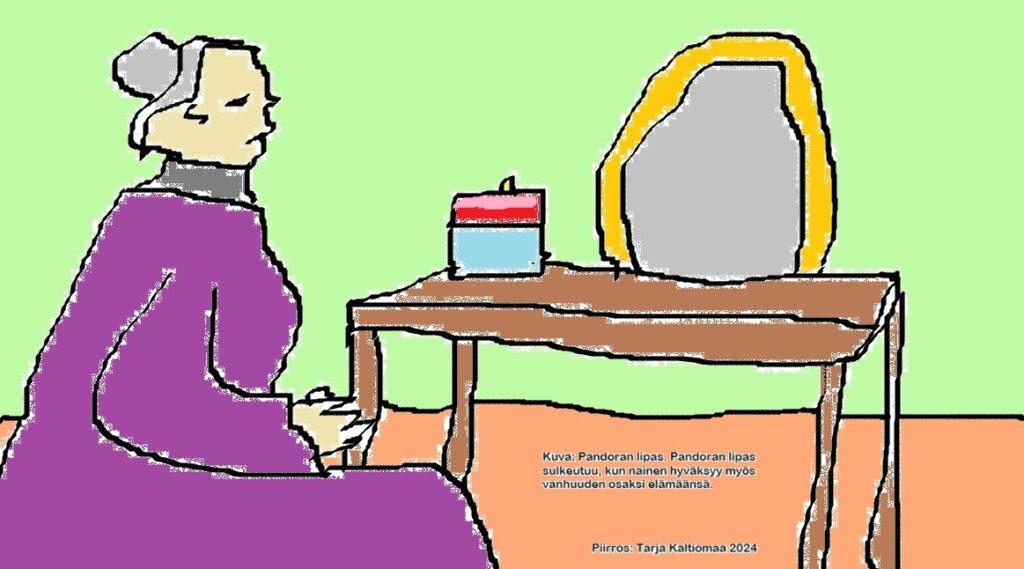 Pandoran lipas täytyy sulkea -piirustus. Tähän liittyy myös teksti, jonka etsin myös. Piirros: Tarja Kaltiomaa