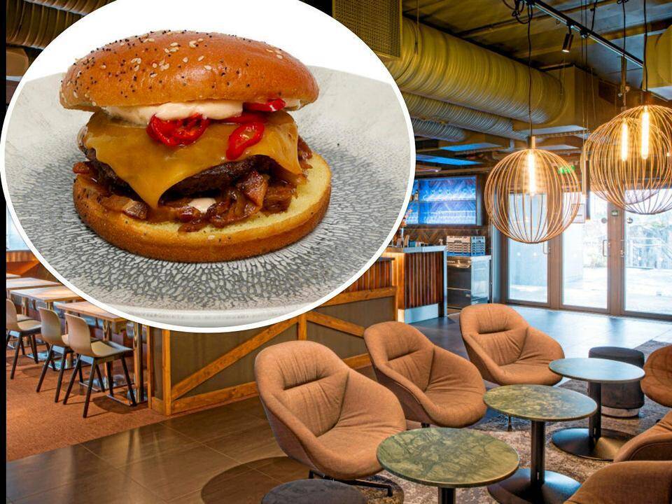 Restelin Food&Events tapahtumaravintolat operoi Veikkaus-areenan ravintoloita. Kuvassa Restelin myymä hampurilainen ja taustalla Legazy-ravintola. Restel