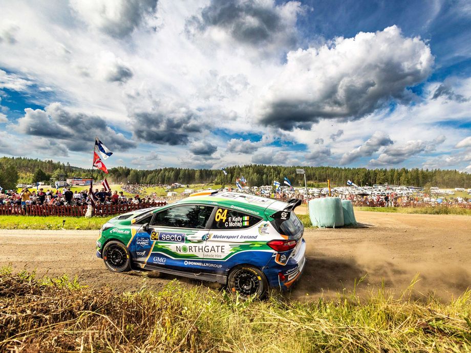 Eamonn Kelly ja Conor Mohan ajoivat rajusti ulos torstaina. Kuva elokuulta Suomen MM-rallista. AOP