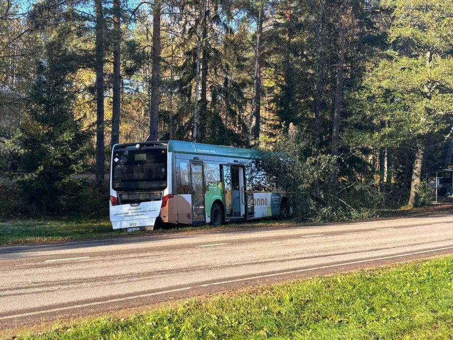 Reittiajossa oleva linja-auto törmäsi suureen puuhun, joka katkesi iskun voimasta. Pelastuslaitoksen päivystävän palomestarin mukaan myös linja-autoon tuli ”selkeitä muodonmuutoksia”.