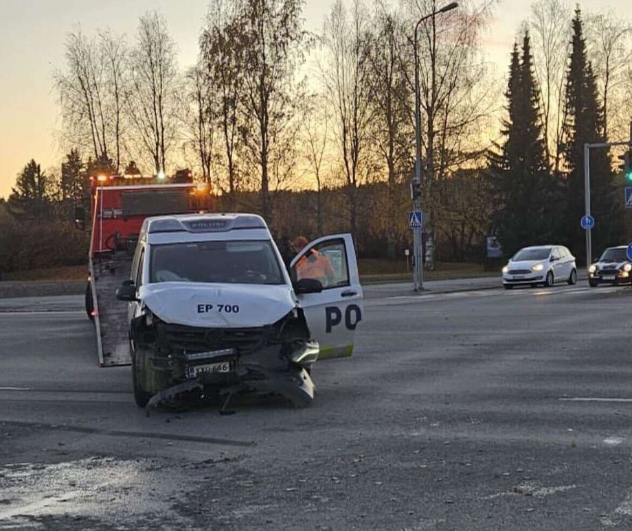 Poliisiauto vaurioitui törmäyksessä henkilöauton kanssa. Lukijan kuva