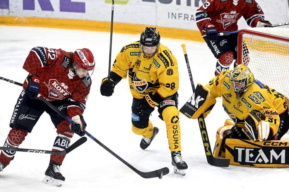 KalPan maalivahti Patrik Kerkola ja hyökkääjä Jaakko Rissanen taistelivat kiekosta Helsingin jäähallissa perjantaina. LEHTIKUVA / VESA MOILANEN