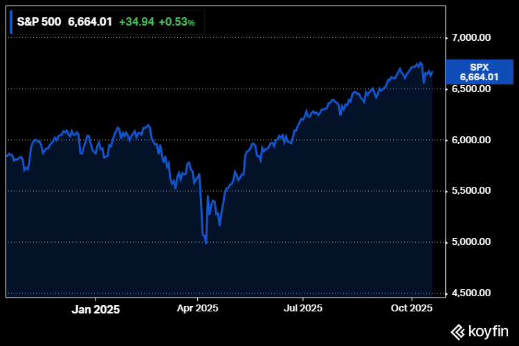 S&P 500 -osakeindeksin kehitys viimeisen 12 kuukauden ajalta. Kuva: Koyfin.