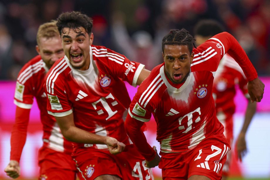 Bayern Münchenin Michael Olise (oik.) tuulettaa voittomaaliksi jäänyttä 2–0-osumaansa. EPA / AOP