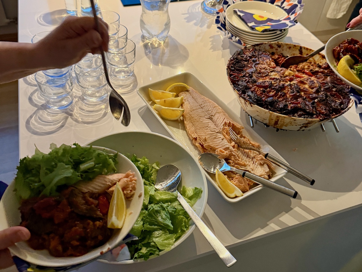 Herkullisista tarjoiluista jäi emännälle vain muruja ja tiskit, kun vieraat poistuivat niin ruumis kuin sielukin ravittuina.