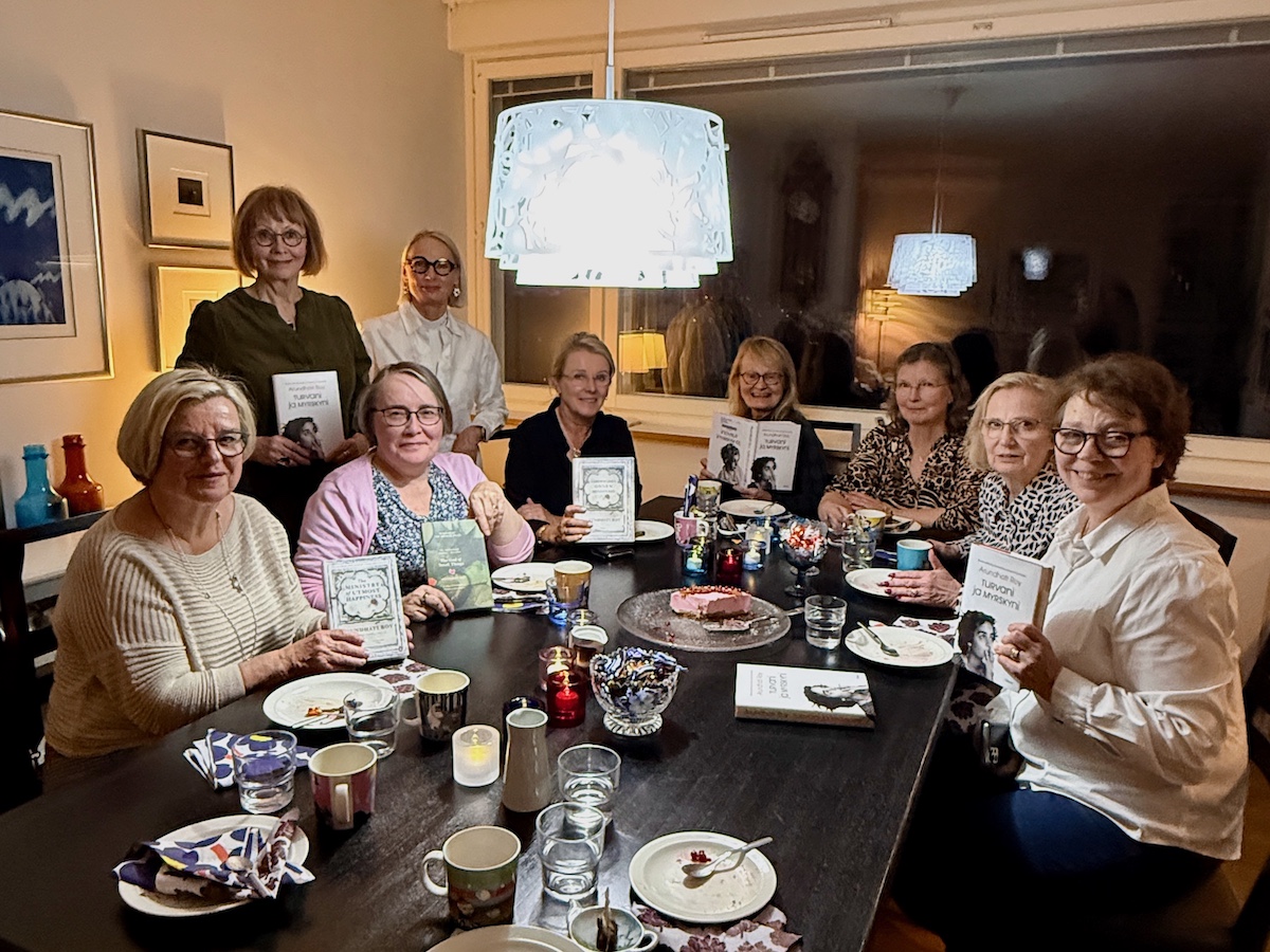 Hymy oli herkässä lukupiirin ylistettyä illan kirjaa Titin loihtimien herkkujen äärellä. Vasemmalta Airi, Pirjo, Raila, Piia, Eija R, Eija T, Minna, Marja ja illan emäntä Titti.