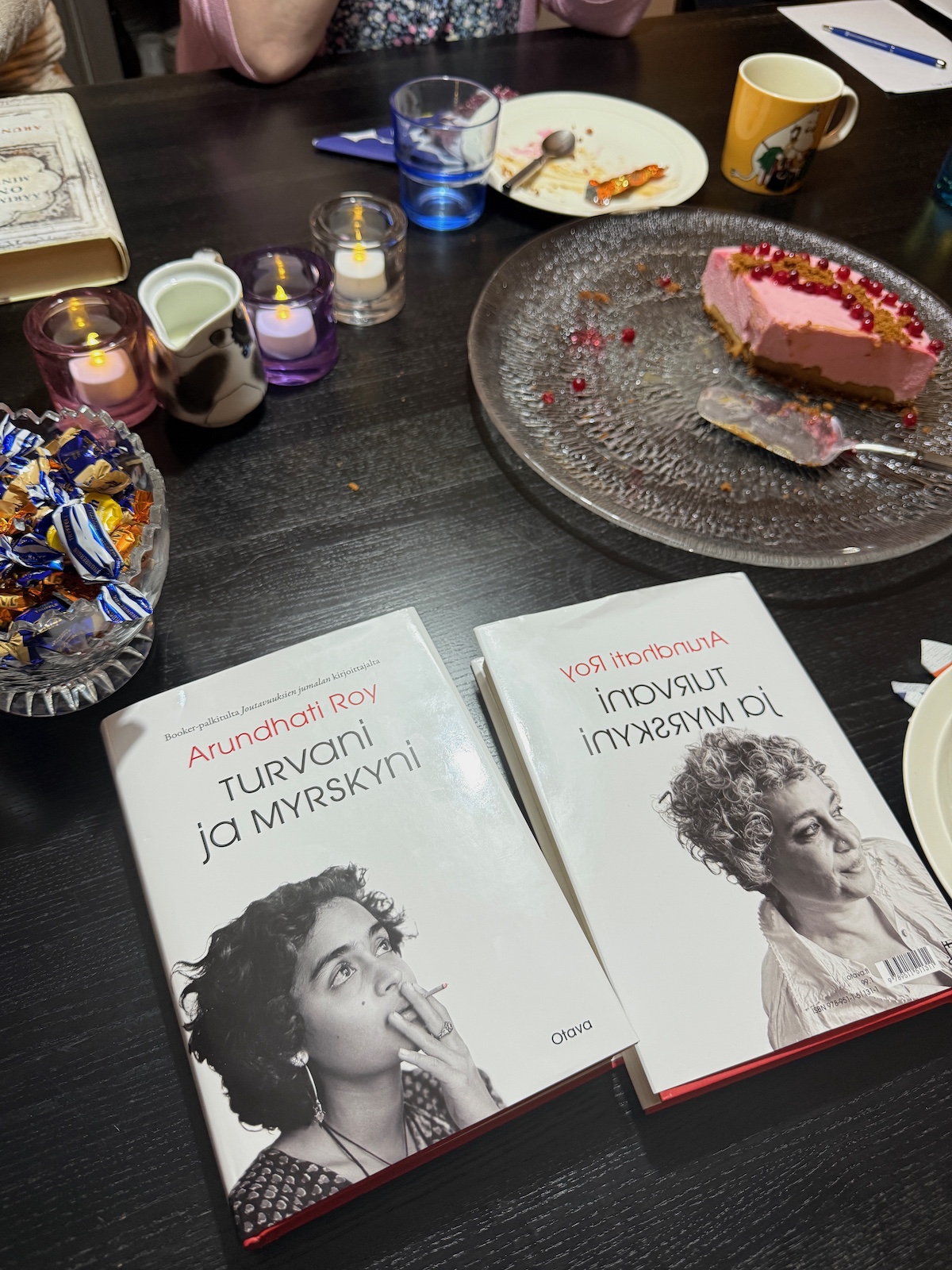 Lukupiirin Airi kirjoitti blogijutut Arundhati Royn kahdesta romaanista toisinkoisen ilmestymisen aikoihin vuonna 2017. Meille muille Roy oli jäänyt vieraammaksi, niinpä äänestimme Turvani ja myrskyni lokakuun 2025 lukupiirikirjaksi. Tämä kirja avaa myös Joutavuuksien jumalan ja Äärimmäisen onnen ministeriön maailmoja ja kirjoitusprosesseja ja siten houkuttaa lukemaan nuo romaanit. Illasta muodostui täydellinen, kirja nosti kaikki peukut ylös, ja eloisaa keskustelua saattelivat Titin loihtimat herkulliset tarjoilut.