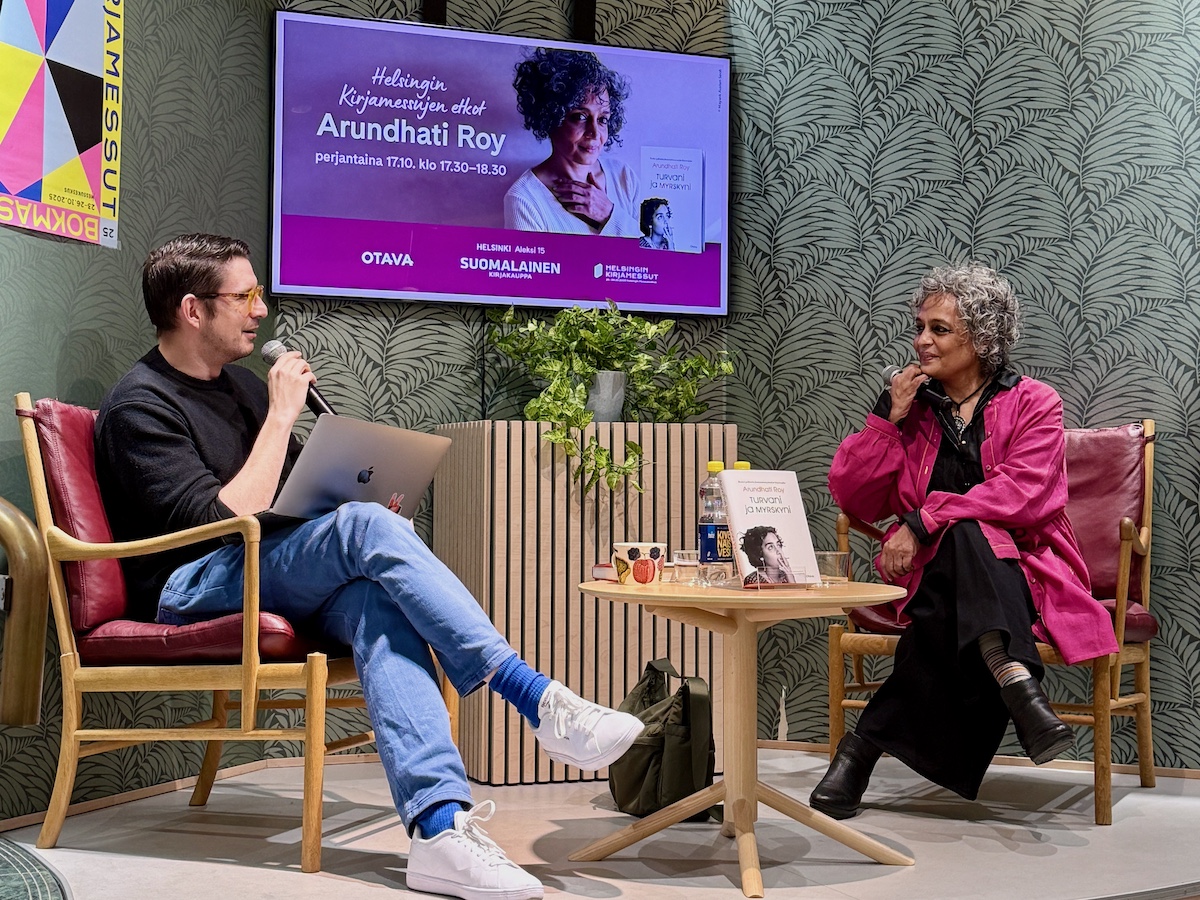 Kirjamessujen etkot Suomalaisessa kirjakaupassa, haastattelijana kirjamessujen ohjelmajohtaja Ville Blåfield. Messujen alkaessa Arundhati on jo jatkanut matkaa.