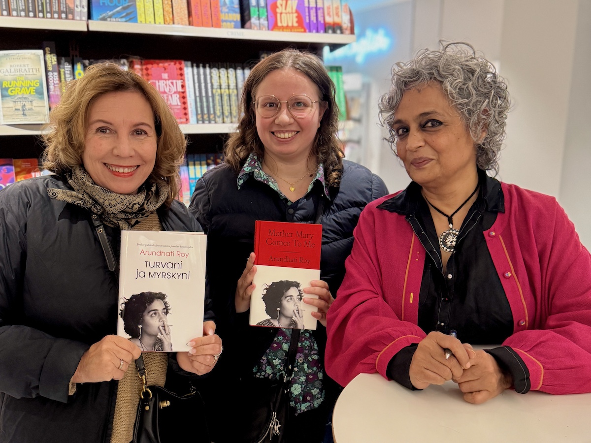 Arundhatilla oli Helsingissä kaksi kirjakauppahaastattelua, Suomalaisessa ja Akateemisessa. Hän on erittäin valovoimainen ja säteilee positiivista energiaa. Kirjan lukeneillekin tuli uutta asiaa, ja hän oli erityisesti vaatinut, että aikaa pitää jäädä myös yleisökysymyksille.