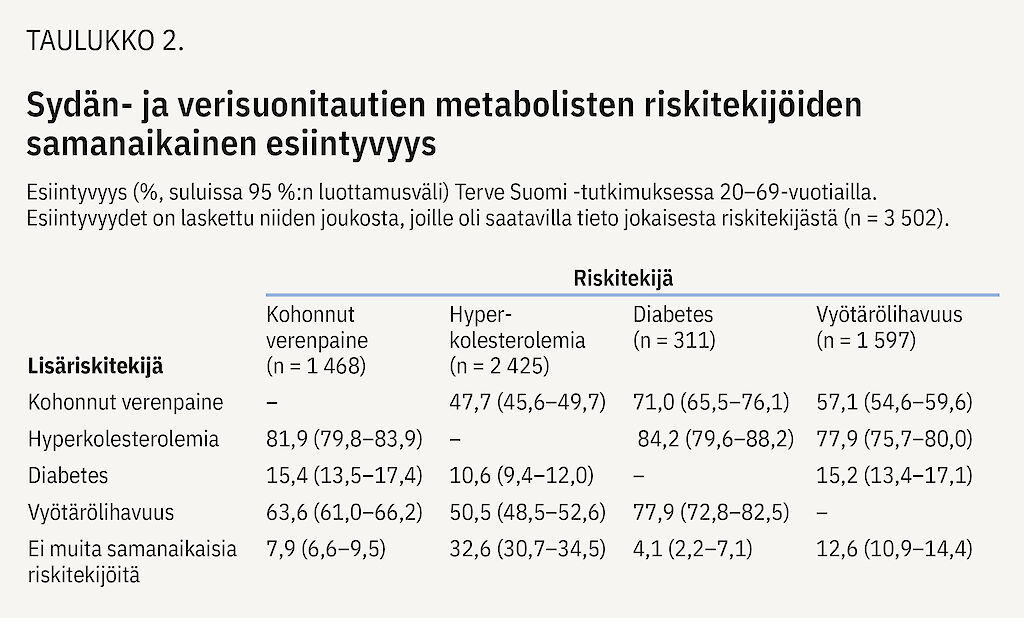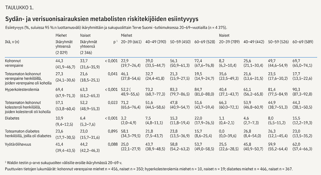 Työikäisillä suomalaisilla yleisin sydän- ja verisuonisairauksien metabolinen riskitekijä oli hyperkolesterolemia (miehet 69,4 %, naiset 63,3 %) ja toiseksi yleisin oli vyötärölihavuus (miehet 41,4 %, naiset 44,2 %) (taulukko 1).