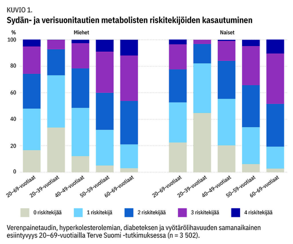 Riskitekijöiden esiintyvyys ja kasautuminen yleistyivät iän karttuessa. 20–39-vuotiaista kolme tai neljä riskitekijää oli 7 %:lla miehistä ja 3 %:lla naisista, kun taas 60–69-vuotiaista yli 10 %:lla oli kaikki neljä riskitekijää ja lähes puolella vähintään kolme.