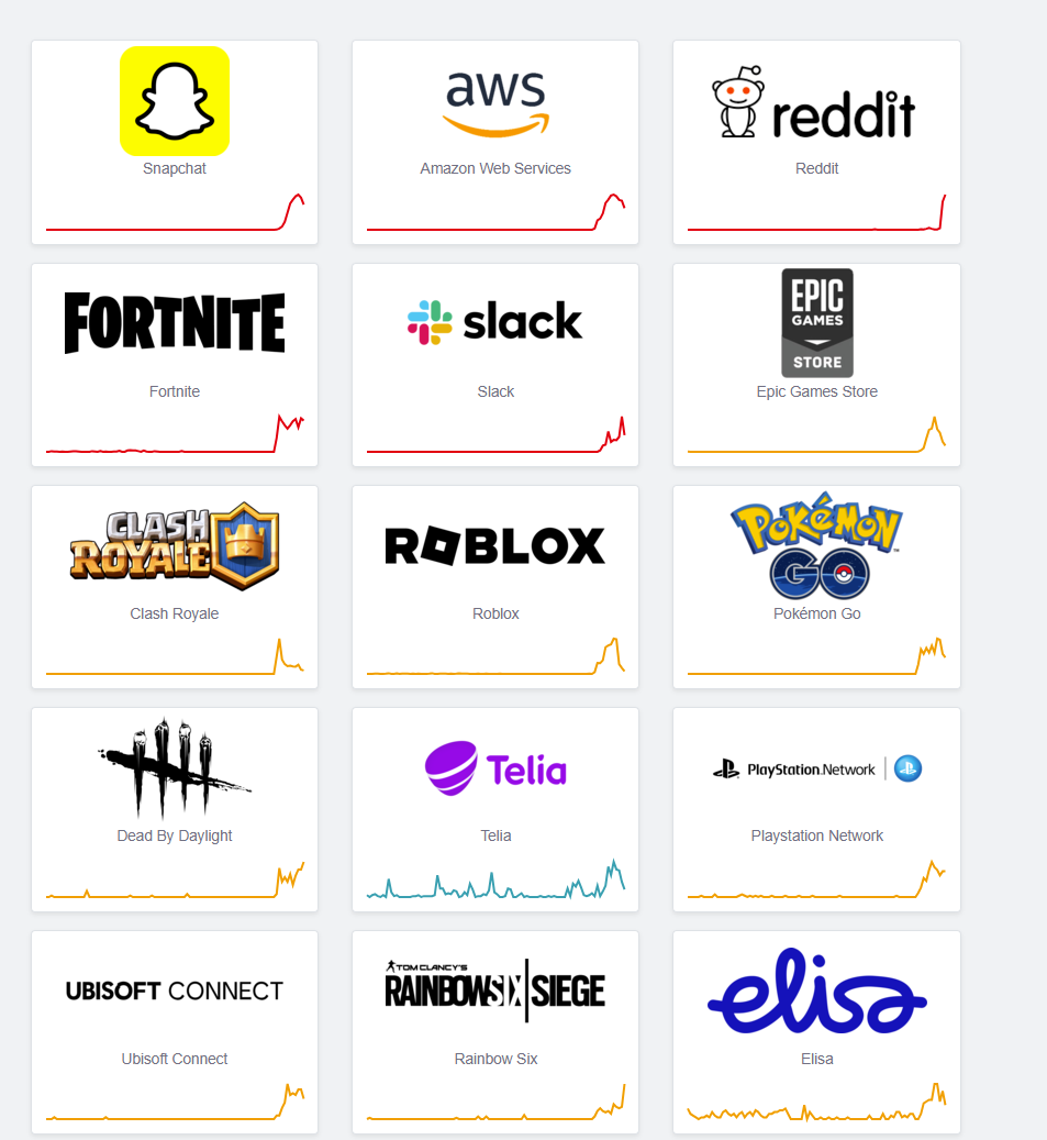 Häiriö vaikutti maanantaina useisiin palveluihin. Kuvassa osa verkkopalveluista, joissa ilmeni häiriöitä. KUVAKAAPPAUS DOWNDETECTOR-SIVULTA
