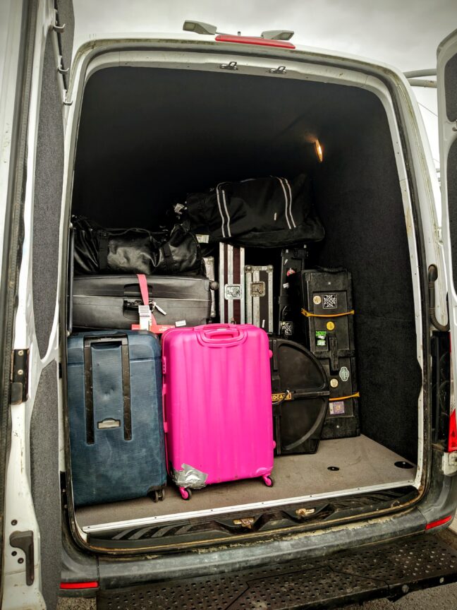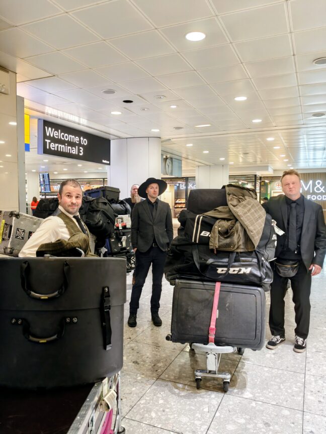 Herätyskello soi neljän jälkeen perjantaiaamuna sen merkiksi, että on aika siirtyä kohti Helsinki-Vantaan lentoasemaa. Kolmeenkymmeneen laatikkoon ja laukkuun pakatut kiertuekalusto sekä henkilökohtaiset tavaramme katosivat lentokentän uumeniin ja ilmestyivät Lontoon Heathrow -lentokentällä takaisin ulos tunnelista. Aina näin ei ole ollut ja tämä on monesti yksi jännittävimpiä asioita kiertueen alussa. Muistuu mieleeni reissu, kun olimme vuonna 2016 soittamassa showcase- eli näyttökeikkaa Ranskassa Transmusicales-festivaaleilla ja korvamonitorijärjestelmämme sisältänyt loota tuli lopulta perille alle tunti ennen esiintymisen alkua. Ranskalainen lentokenttävirkailija sanoi meille silloin rehellisesti, että hänellä ei ollut mitään käsitystä, missä kadonnut laatikko oli. Jostain he sen kuitenkin kaivoivat esiin. Toisen kerran Lontoon ja Helsingin välillä meiltä hävisi 12 kuljetuskoteloa. Onneksi silloin oli muutaman päivän tauko esiintymisistä. Tällä kertaa ainoa kateissa ollut tavara oli basistimme Luigin puhelin, joka jäi Suomeen. Tällainen asia aiheuttaa näinä päivinä jonkin verran säätöä.