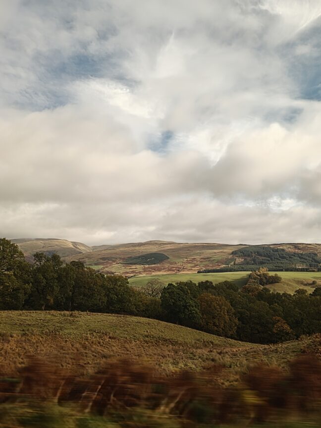 Tällä hetkellä ajamme kohti Skotlantia ja ajatuksissa siintää illan keikkapaikka La Belle Angele Edinburghissa. Auton sivuikkunassa vilisee todella kaunista maaseutua ja syksy näyttää tulevan myös tänne. Illalla täytyy muistaa, että emme ole enää Englannissa. ”Hello England” -tyyppinen aloitus ei mene täällä läpi huumorina.