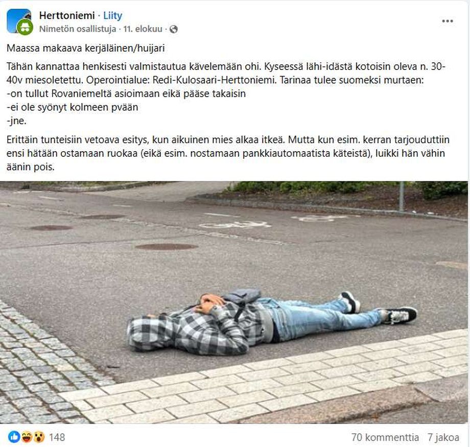 Maassa makoilevasta ja rahaa pyytävästä miehestä on useita havaintoja sosiaalisessa mediassa. Kuvakaappaus Facebook-ryhmästä. Kuvakaappaus