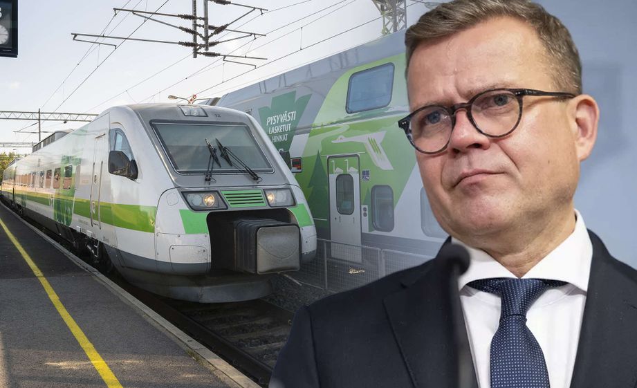 Kokoomus ja pääministeri Petteri Orpo (kok) liputtavat Turun tunnin junan puolesta. Santeri Rosenvall