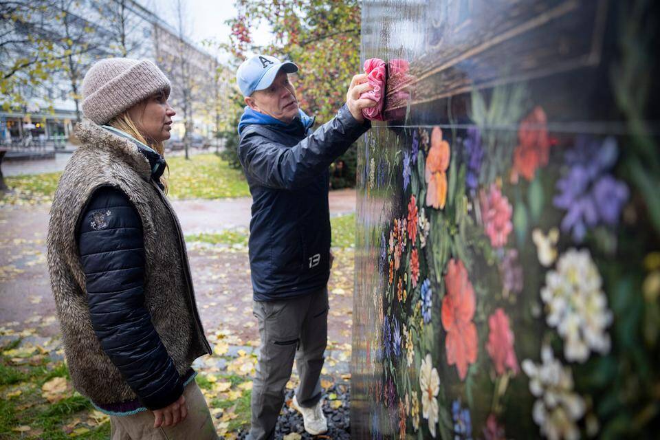 Taiteilija Riikka Arte (vas.) ja yrittäjä Ralf Karlsson puhdistivat Kirkkopuiston taideteosta. Arte aikoo puhdistaa teoksen tarvittaessa jatkossakin. Hanna Marjanen