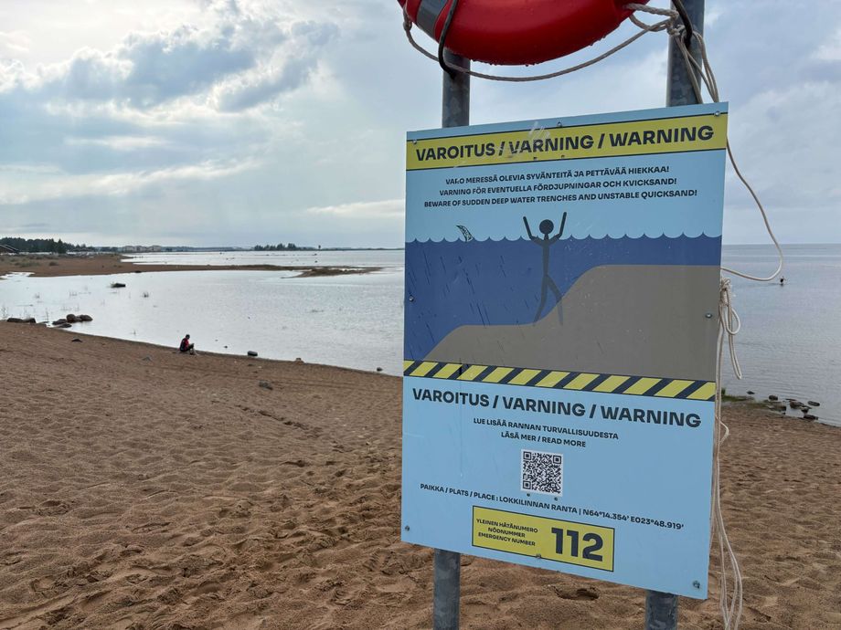 Tällaisilla kylteillä rannalla on jo ennestään varoitettu hiekkasärkkien riskeistä. Riika Tauriainen